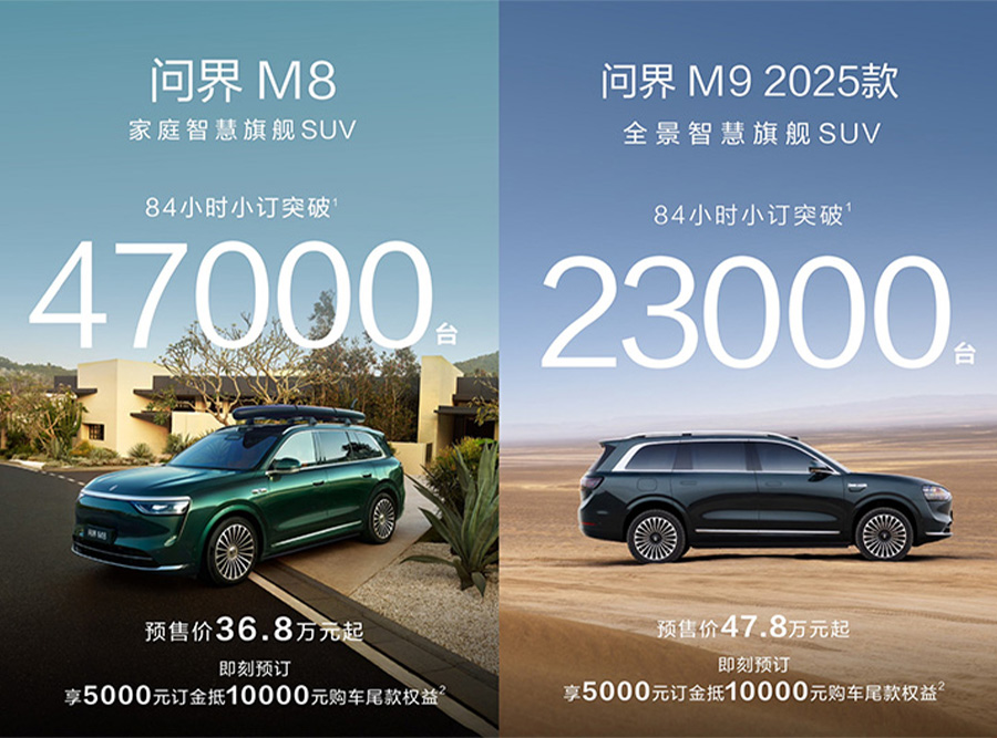 3月10日消息,鸿蒙智行官方于近日宣布,旗下的问界M8车型和2025款问界M9车型84小时小订分别突破4 7万台和2 3万台。图片来源:鸿蒙智行据悉