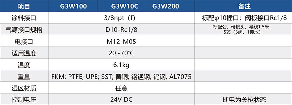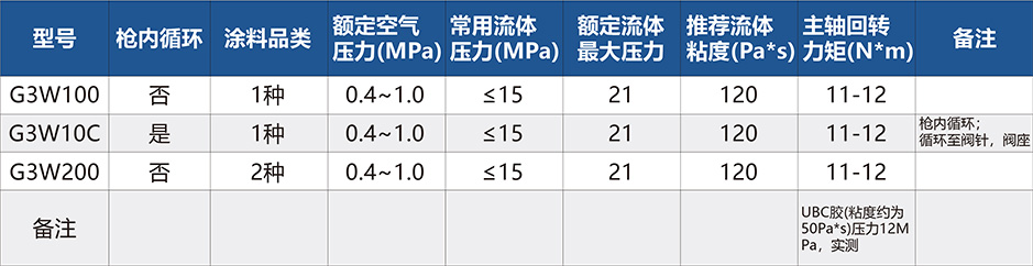 G3W100:普通型,一种涂料无内循环;G3W10C:一种涂料可进行内循环;G3W200:适用于两种涂料无法进行内循环