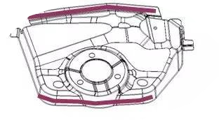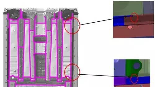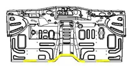 装车后不可见区域的焊接密封胶可在涂胶完成后使用刷子或刮板处理以保证密封性能;有外观要求的区域,必须使用规则的喷嘴在指定位置打胶,注意覆盖缝隙和孔洞。打胶后不允许用刷子涂抹,以此保证美观,在前地板工艺缺口处必须用焊缝胶补满,如图4所示。