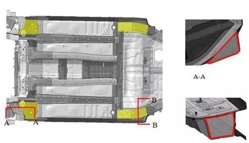 隔振胶主要用于车门外板、侧围外板和顶盖等板件处,主要作用为减震,用于提高汽车的NVH性能,膨胀率范围100%~300%。膨胀胶涂在相应的储胶槽位置。