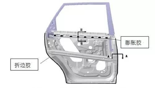 折边胶主要是用于车门、引擎盖和行李箱盖外板的包边,代替焊点连接内、外盖板,避免车身表面出现焊接而造成的凹坑,提高车身的外观质量。如图1所示