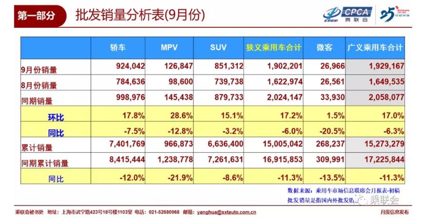 另外乘联会分析指出,从9月份的批发销量来看,SUV、轿车和MPV均出现萎缩态势,新能源市场的高增长逐步降温。