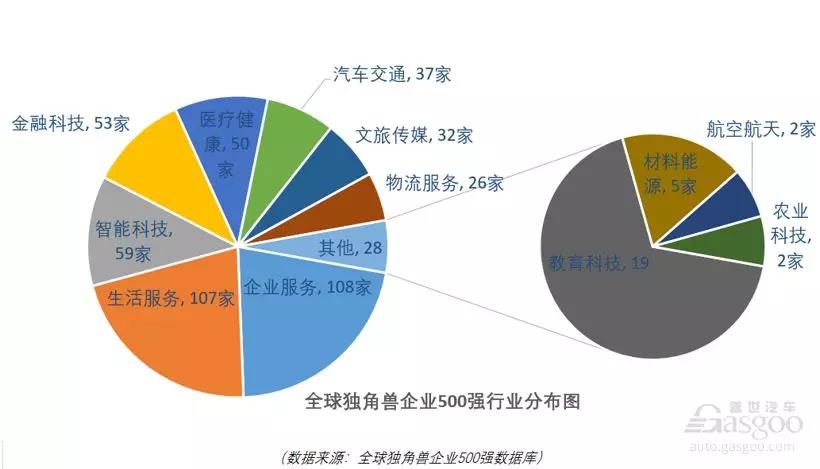 从行业分布来看,全球独角兽企业主要分布于12个领域,分别为企业服务、生活服务、智能科技、金融科技、医疗健康、汽车交通、物流服务、文旅传媒、教育科技、材料能源、航空航天和农业科技。当中企业服务,生活服务成集中爆发领域,分别有108家,107家。