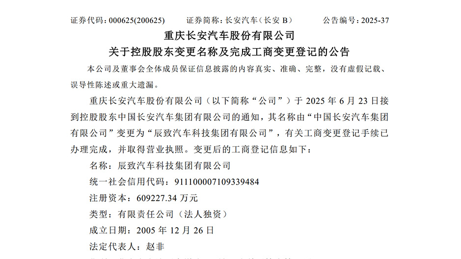 6月23日晚,长安汽车(000625)发布公告称,接到控股股东中国长安汽车集团有限公司(以下简称中国长安汽车集团)的通知,其名称由“中国长安汽车集团有限公司”变更为“辰致汽车科技集团有限公司”(以下简称辰致汽车),有关工商变更登记手续已办理完成,并取得营业执照。